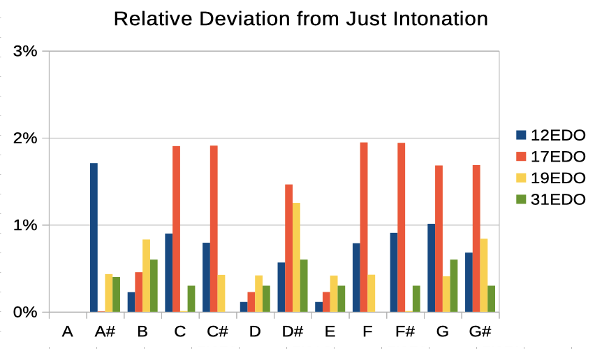 Even the usual 12 equal divisions of an octave—that is, 12 EDO—doesn’t perfectly match doesn’t perfectly match just intonation. We use it because an instrument has to be tuned to a specific key in just intonation, and then it won’t work for other keys.3 If you’re not familiar with tuning, I’ll try to sum it up by saying that sound is all about vibration. The plucking of a single string actually produces a multitude of subtle harmonics along pure fractional ratios. These fractional ratios are what make up the different notes in a scale tuned according to just intonation, and aren’t evenly spaced, so even 12 EDO doesn’t hit all the notes in a way that perfectly matches the harmonics. But how well do xenharmonic scales match just intonation? To give a sense of how accurately these different scales reproduce familiar music, I compared their frequencies to the regular 12 EDO: