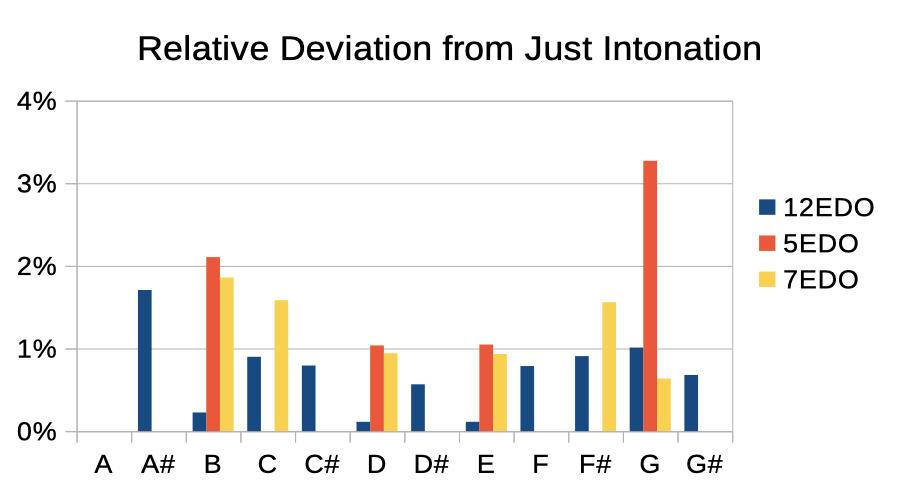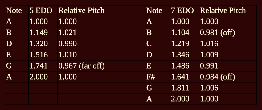 The typical distance between half-steps in just intonation is around 6%, so the “G” from 5 EDO really splits F# and G, and the B sounds odd in both 5 EDO and 7 EDO—enough that those are notes that would ordinarily sound far out of tune in a conventional context.